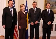 Hillary Diane Rodham Clinton, 67ème secrétaire d'État américaine, a entamé une visite aux Balkans. Elle a d'abord rencontré les membres de la présidence collégiale de Bosnie-Herzégovine : Haris Silajdzic, Zeljko Komsic et Nebojsa Radmanovic.