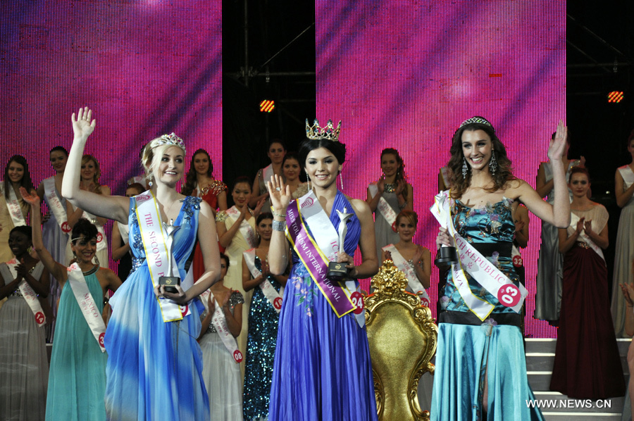 La championne Jenny (centre) de l'Islande, la deuxième, Lexi des États-Unis et la troisième, Babora de la République tchèque font un salut lors de la finale du concours de Miss Tourisme International 2010, le 17 décembre 2010 à Zhanjiang, dans la province du Guangdong, dans le sud de la Chine.