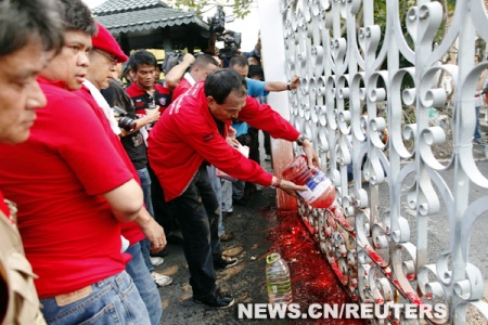 Les manifestants 'chemises rouges' du Front uni pour la démocratie contre la dictature (UDD, antigouvernemental) ont répandu mardi à 16H55 locales du sang devant le siège du gouvernement thaïlandais, afin de faire pression sur le gouvernement pour qu'il dissolve le Parlement.
