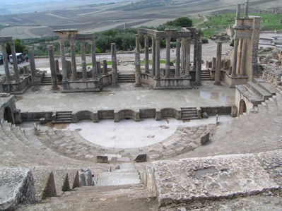 Dougga et son théâtre qui vous accueille dès l'entrée du site. On s'attendrait, presque, à voir surgir des gradins les spectateurs romains en toges blanches et les femmes couvertes de bijoux ou encore le Grec Ulysse sortant des thermes des Cyclopes.